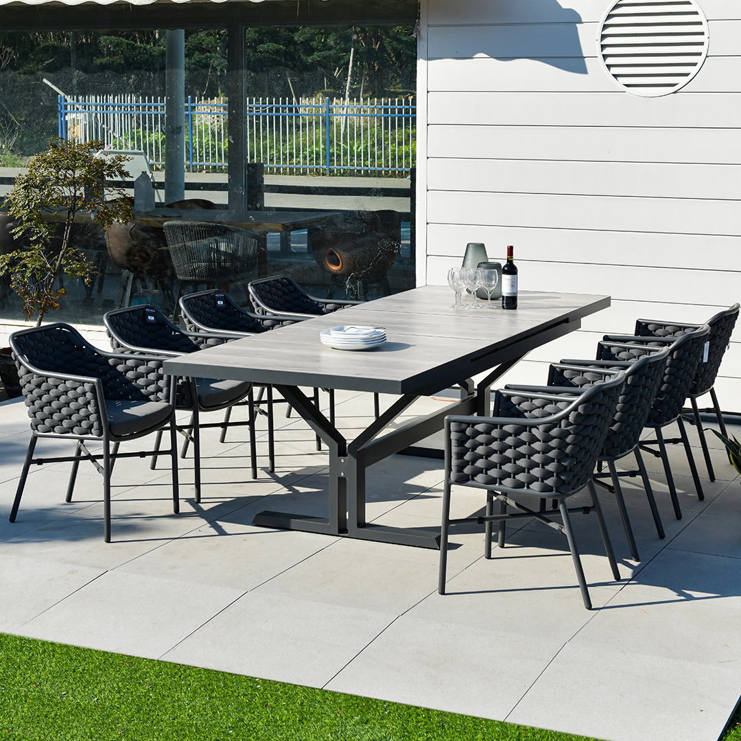 This outdoor extendable dining table combines modern design with all-weather durability. Built with a rust-proof, 7-step powder-coated aluminum frame, it's ideal for any patio, garden, balcony, or deck. The high-grade sintered stone tabletop is heat, scratch, and stain-resistant, offering long-lasting elegance. With its expandable design, this weather-resistant, heavy-duty outdoor dining table easily adapts for hosting extra guests, making it the perfect luxury outdoor dining furniture for any occasion.